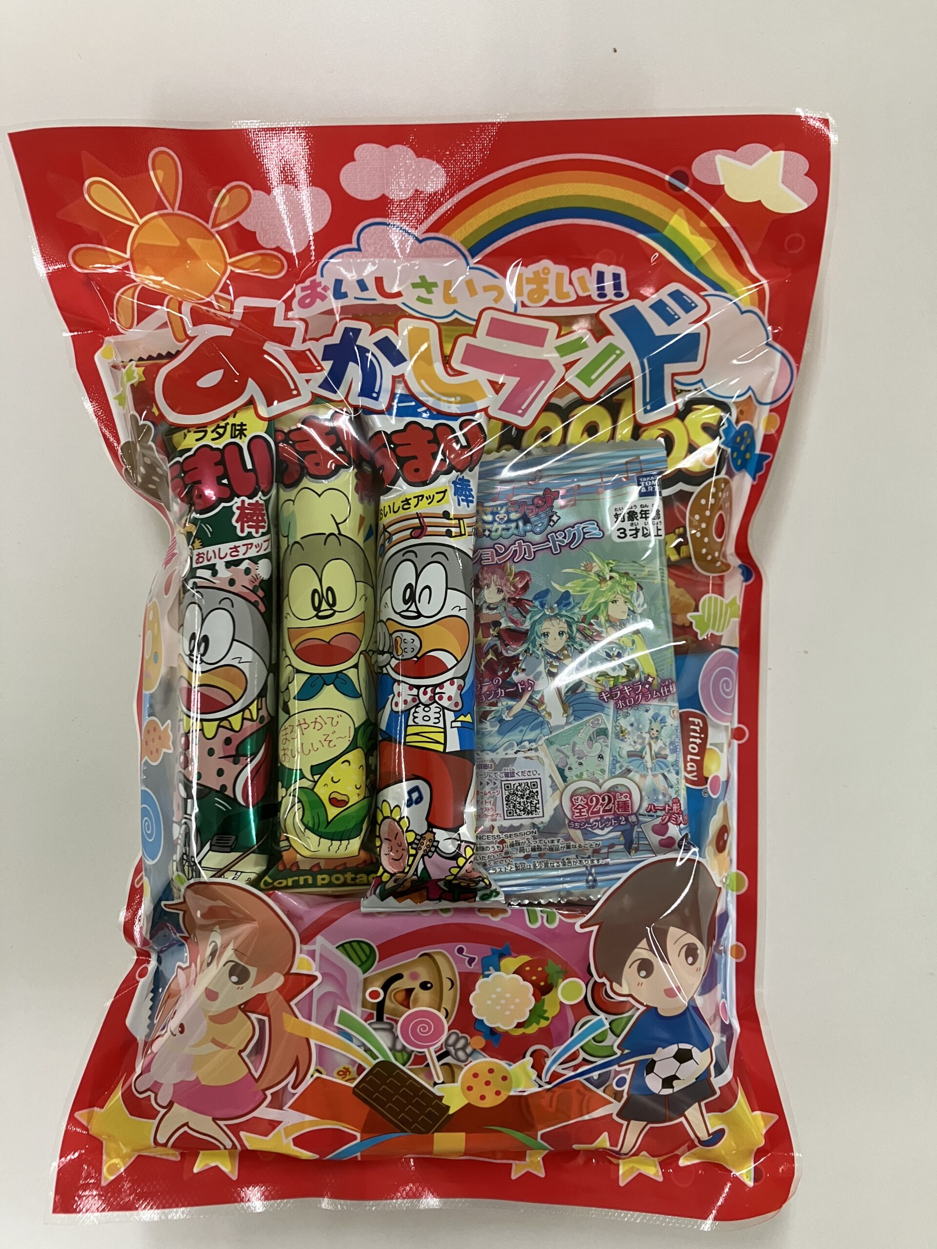 スナックを中心に詰め合わせた商品です。キャラクター商品はいつも同じものではなく、飽きがこないように変更しています。